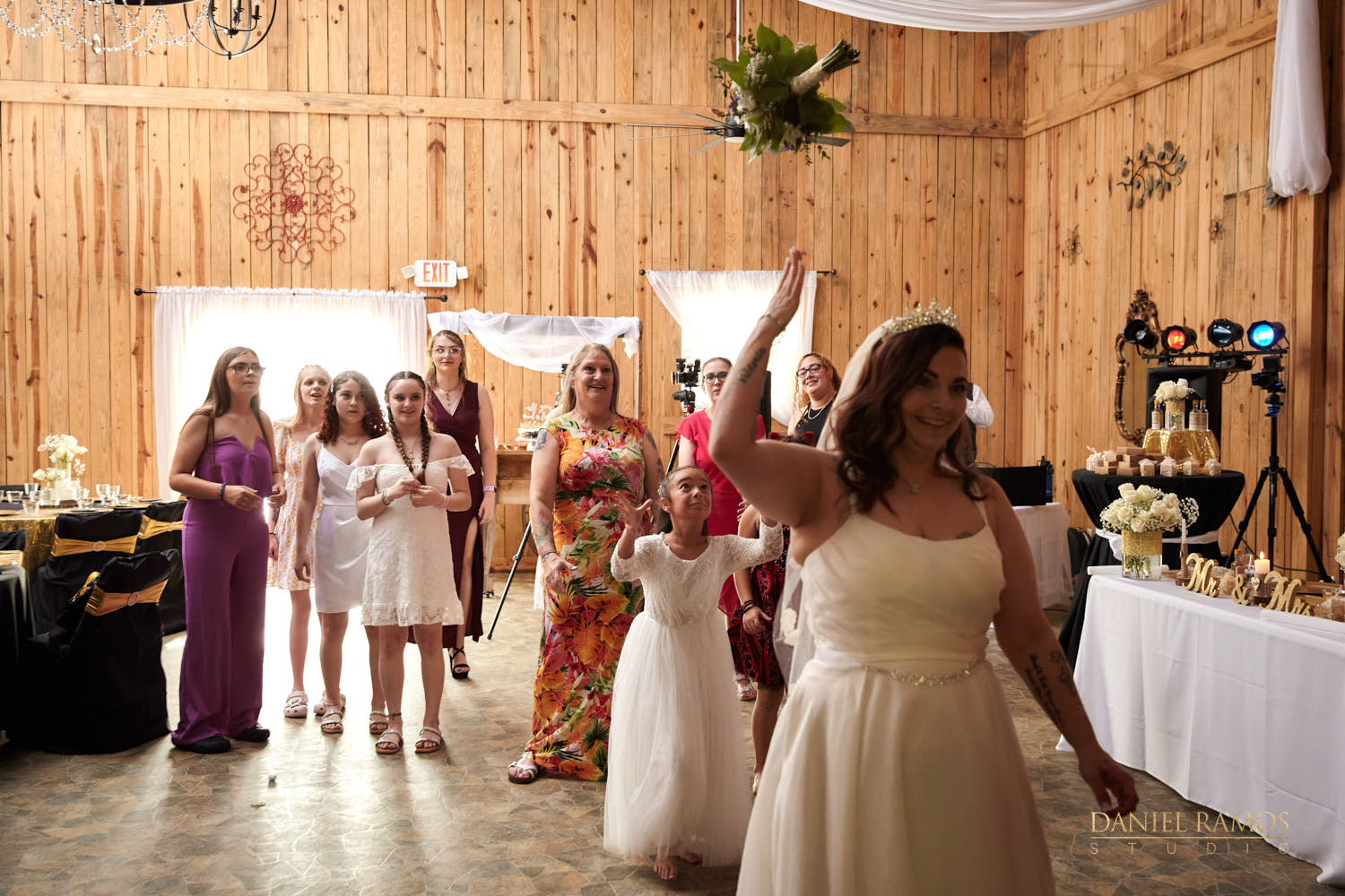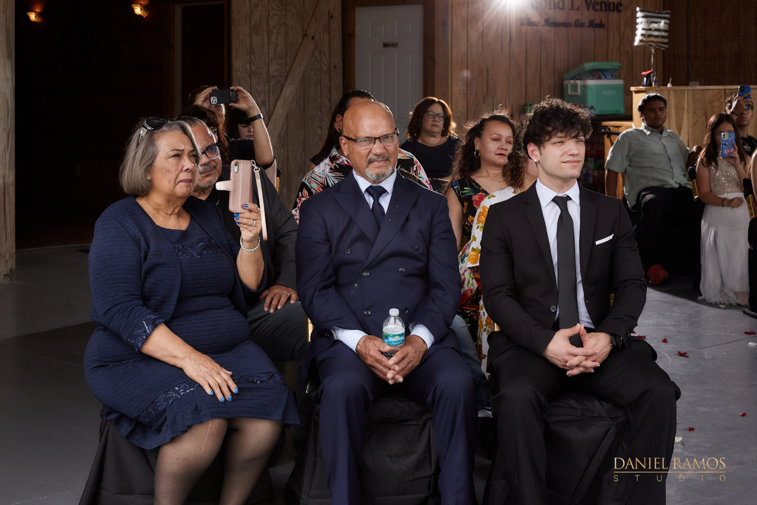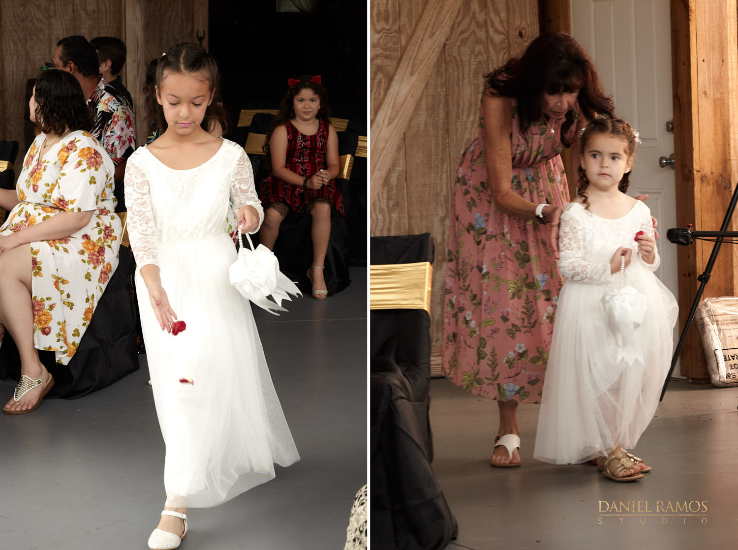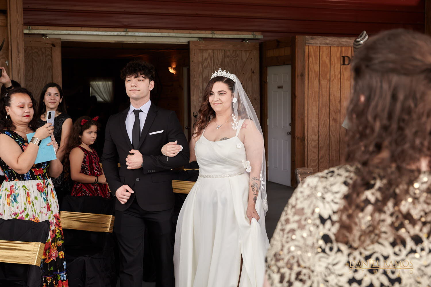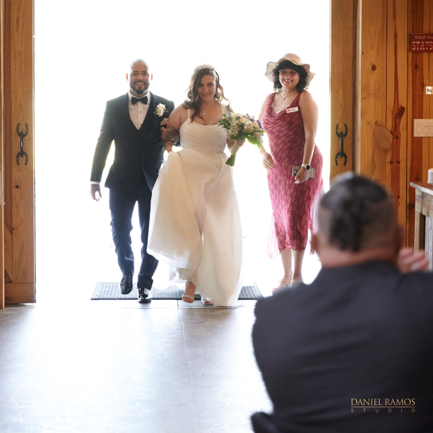The ceremony was to take place outdoors on rustic benches and in front of a farm but the rain had other plans for us. So we moved inside the barn patio which ended up working just fine. I quickly set up all my nine cameras to capture all the moments that were about to take place.