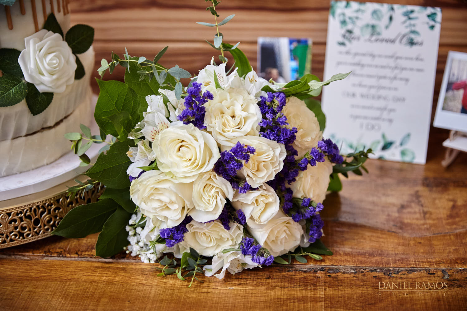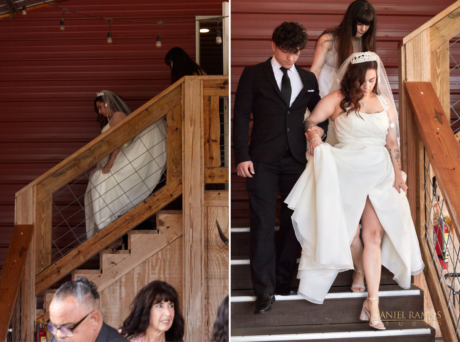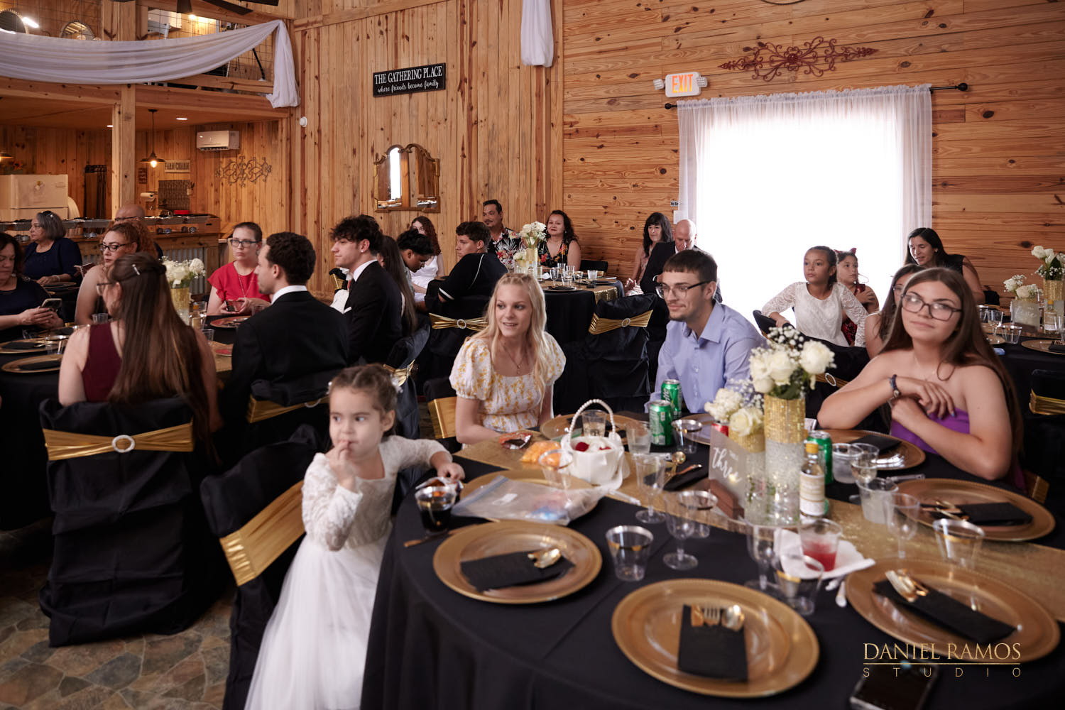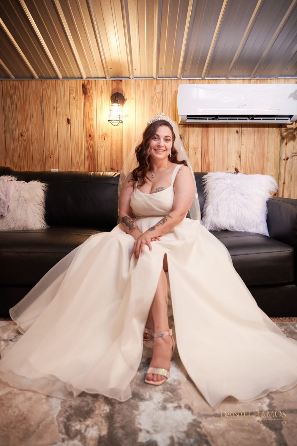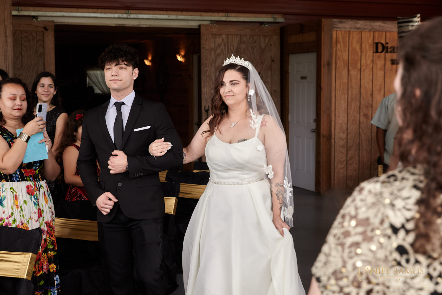 The ceremony was to take place outdoors on rustic benches and in front of a farm but the rain had other plans for us. So we moved inside the barn patio which ended up working just fine. I quickly set up all my nine cameras to capture all the moments that were about to take place.
