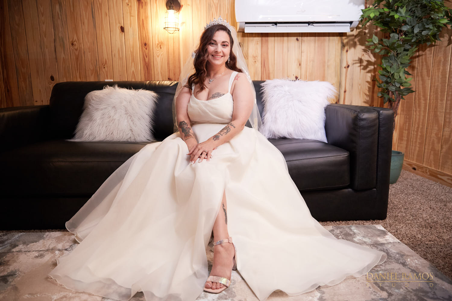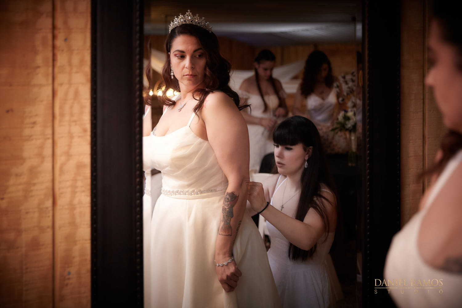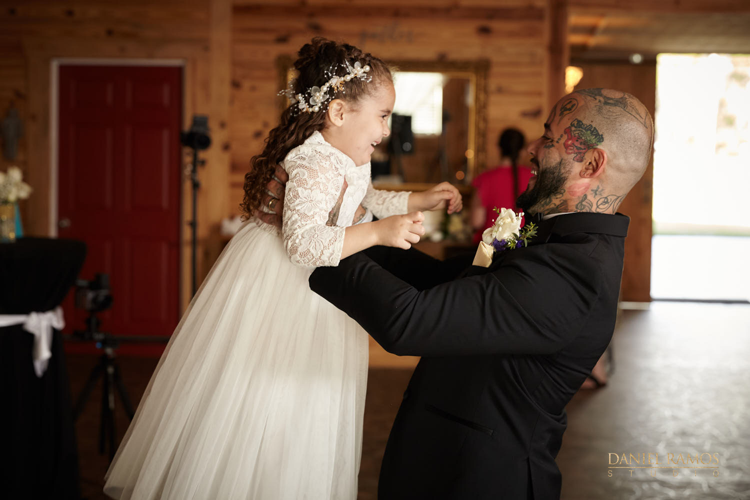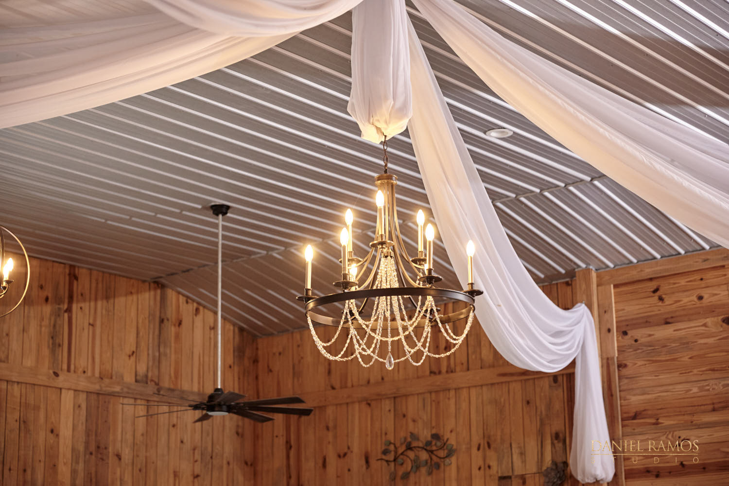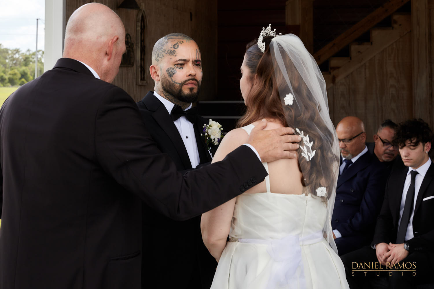 The ceremony was to take place outdoors on rustic benches and in front of a farm but the rain had other plans for us. So we moved inside the barn patio which ended up working just fine. I quickly set up all my nine cameras to capture all the moments that were about to take place.