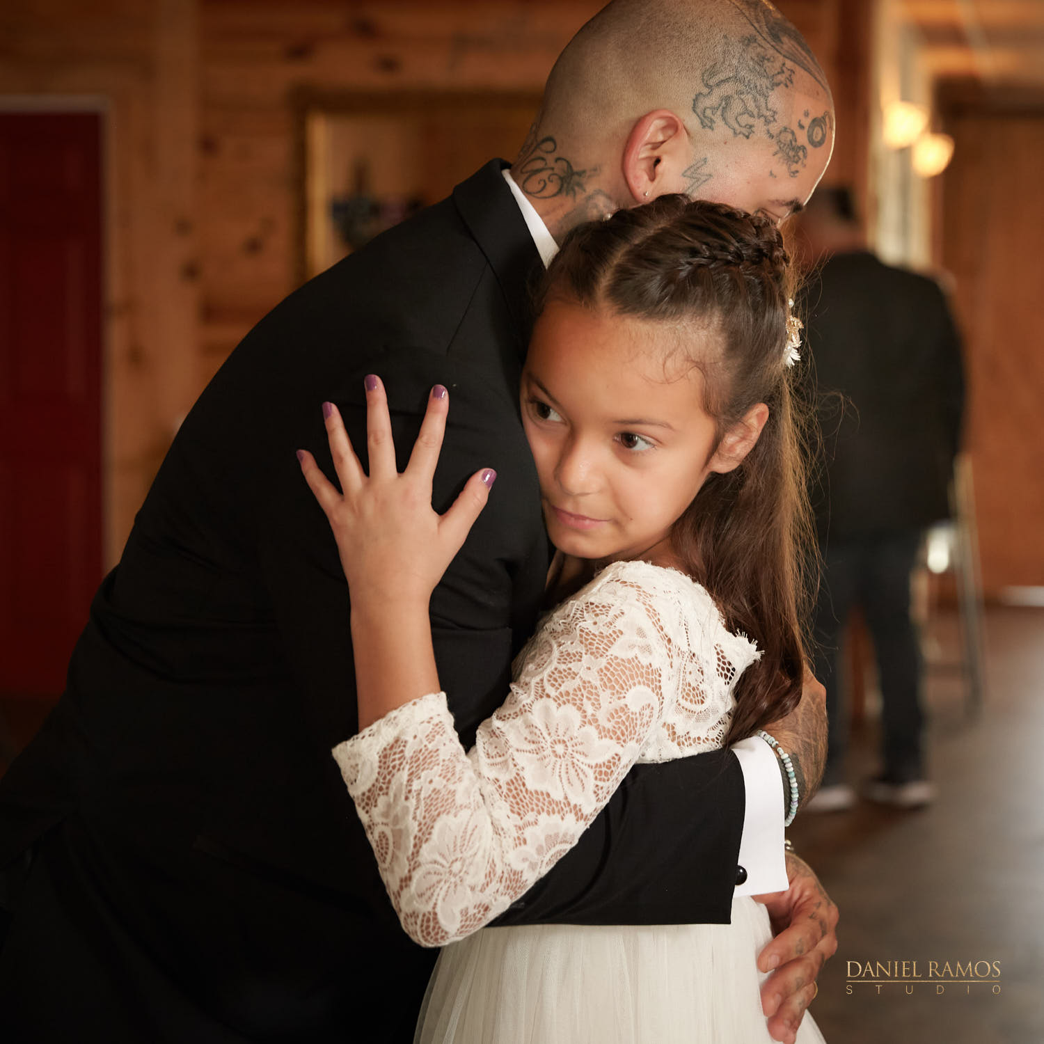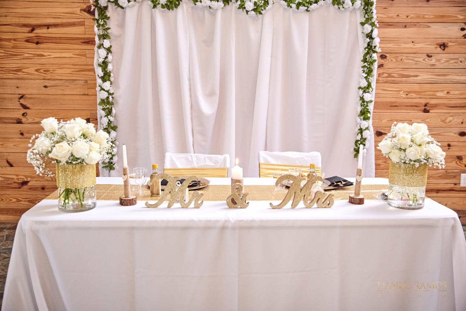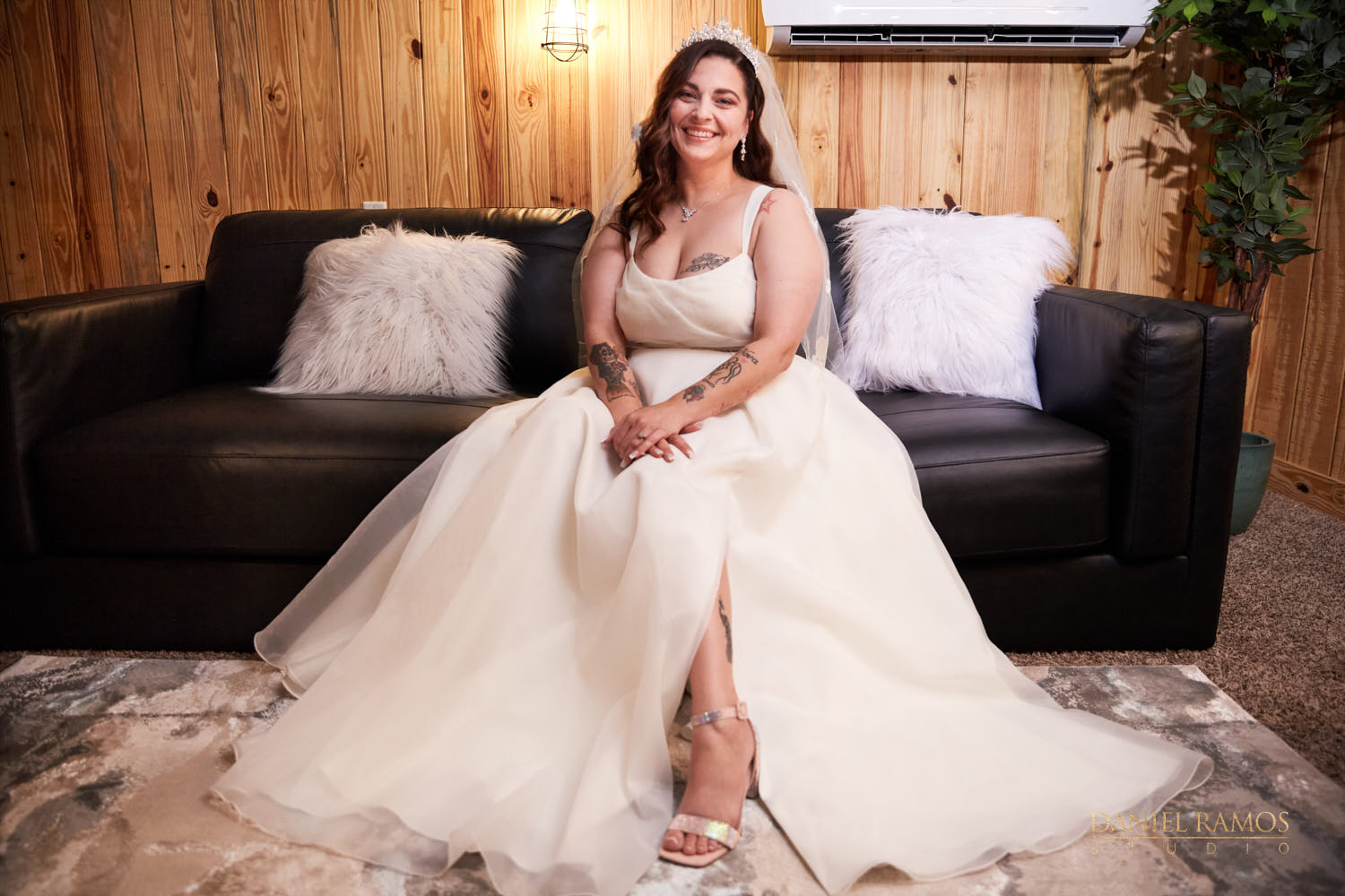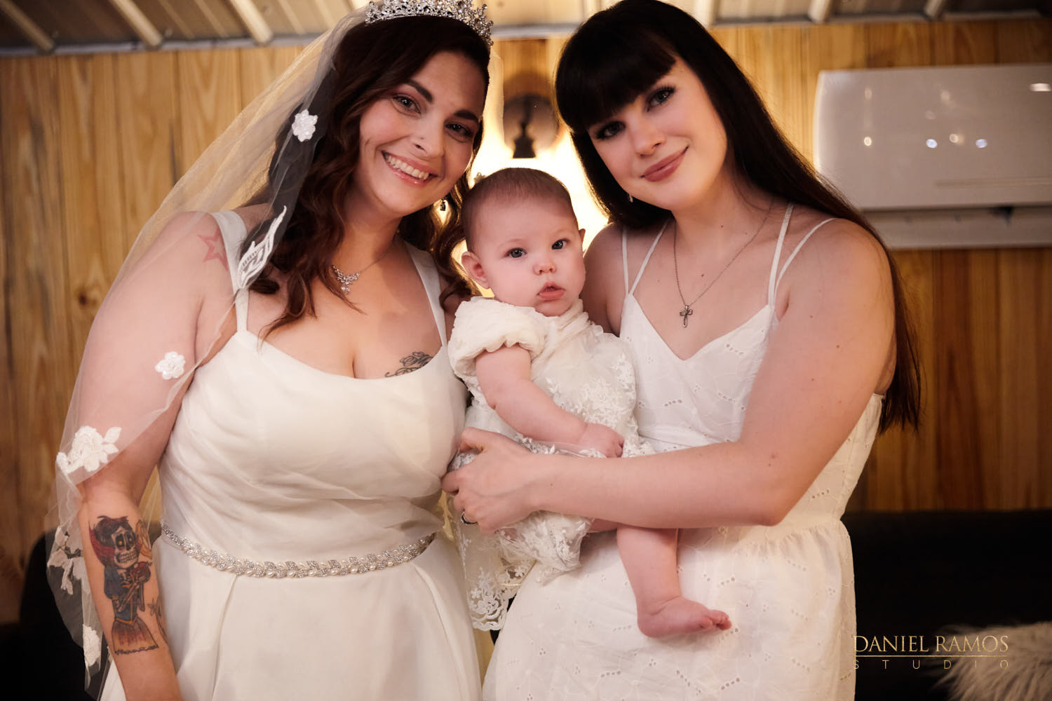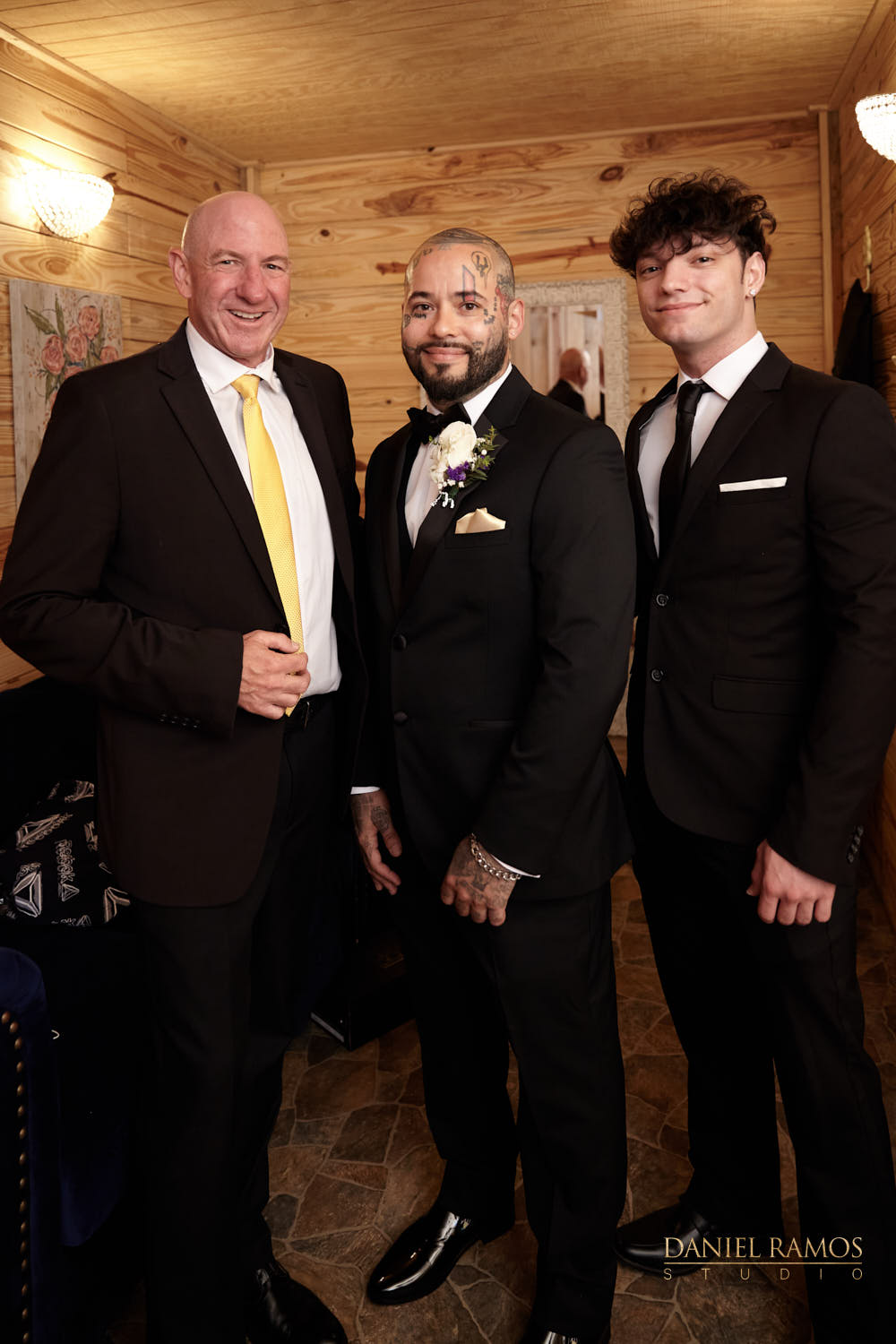 The ceremony was to take place outdoors on rustic benches and in front of a farm but the rain had other plans for us. So we moved inside the barn patio which ended up working just fine. I quickly set up all my nine cameras to capture all the moments that were about to take place.