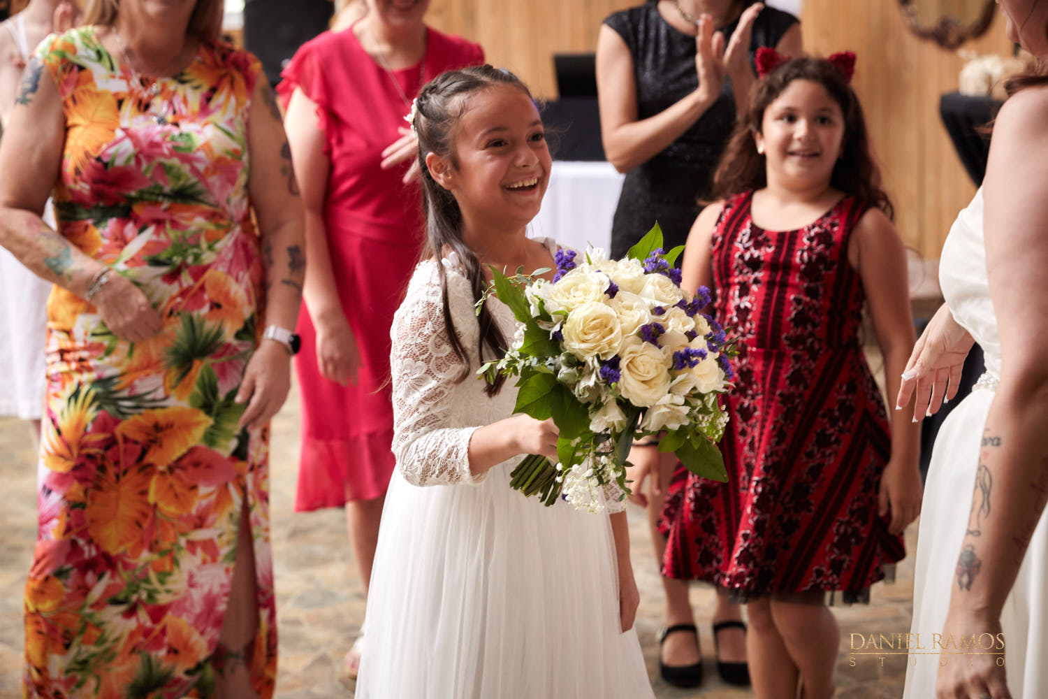 The ceremony started with the groom taking his place in front of the crowd just after greeting family and friends. Soon after the family procession started, then the flower girls, which provided a sweet moment where one of them got a little nervous and ran to the back which provided a little humor for everyone. Luckily she was brought back being carried (as a princess should be).